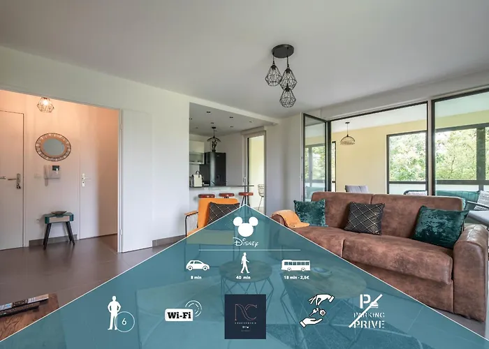 Az apartman Montévrain városában helyezkedik el, egy 25 perces sétára a központtól. A Leon De Bruxelles francia ételeket kínál vendégeinek 600 méterre a szállástól. A Disneyland-Paris 8Personnes, Wifi, Netflix apartmantól egy rövid sétára van a Parc du Mont Evrin.